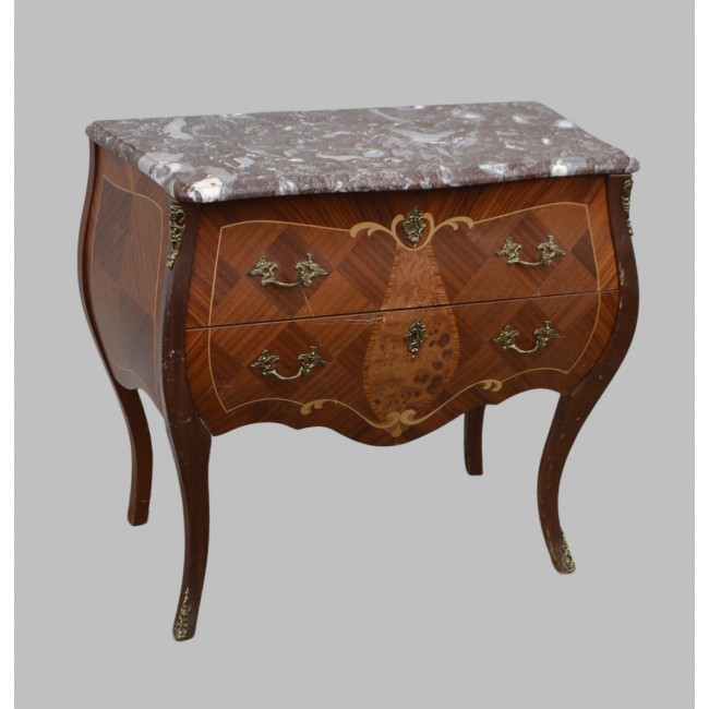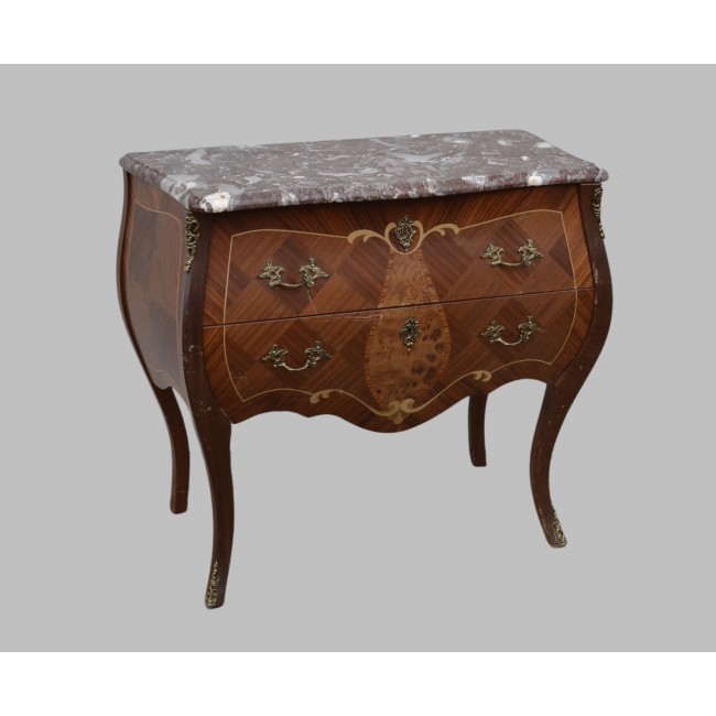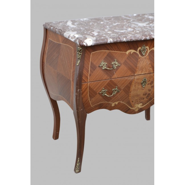 Comoda in stil francez, din lemn, cu intarsii, aplicatii din bronz si placa de marmura.