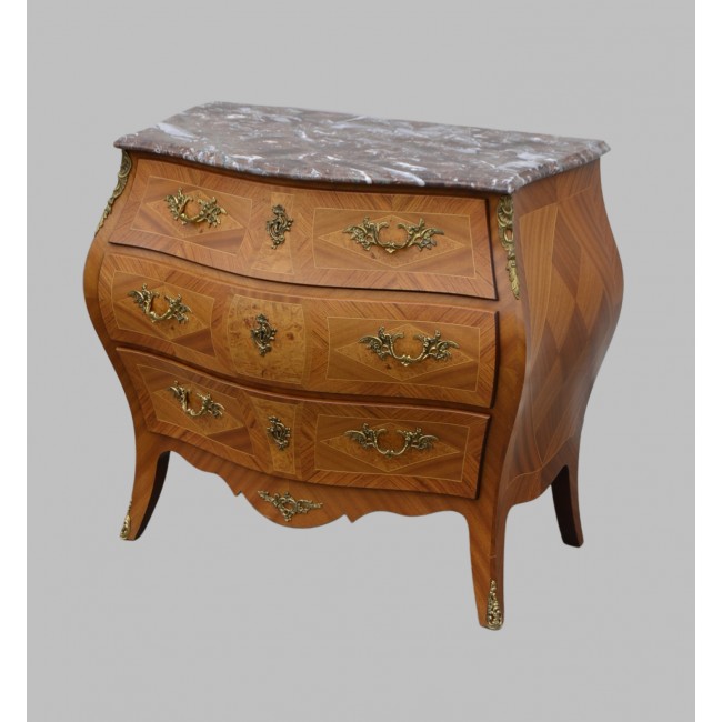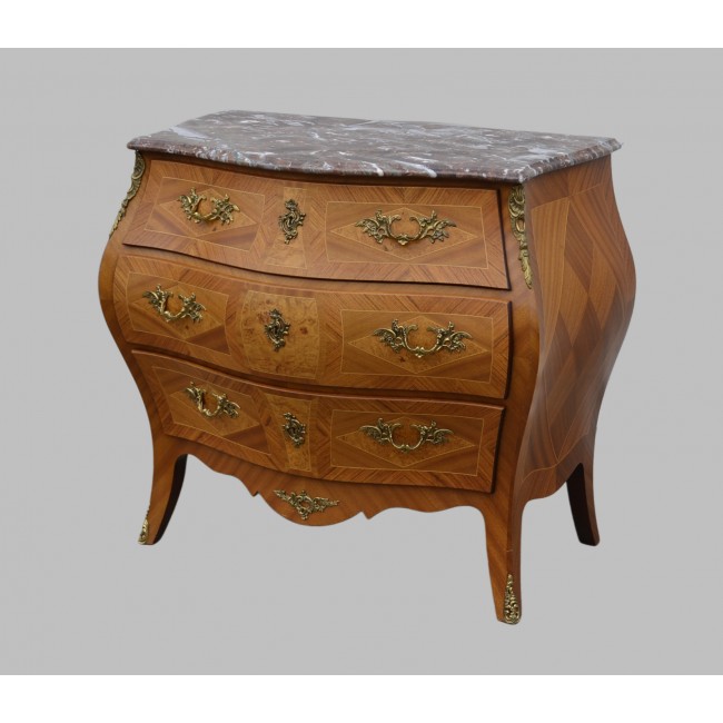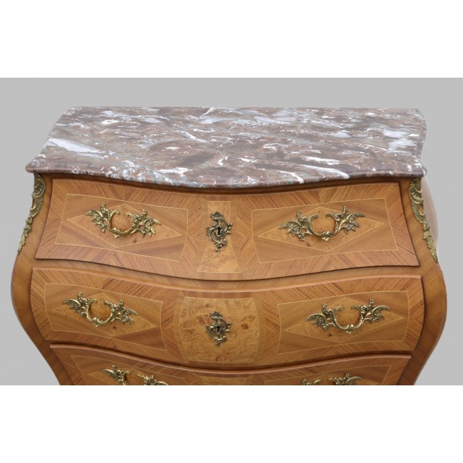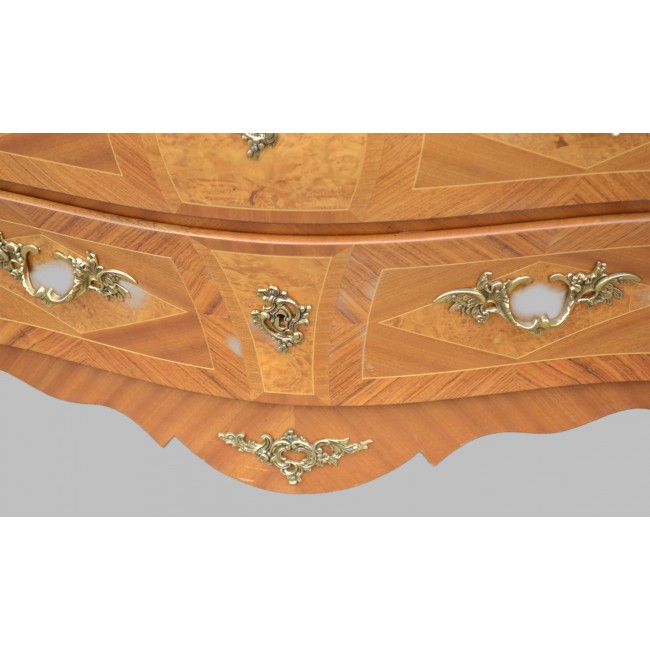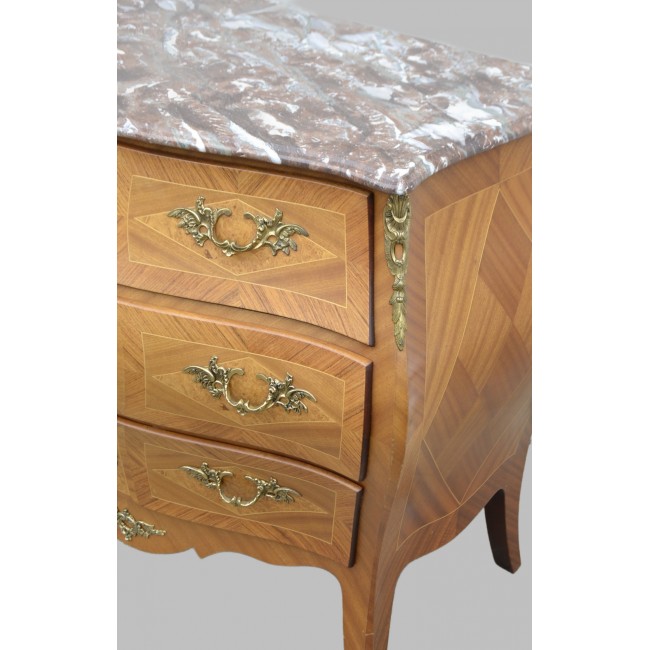 Comoda in stil francez, din lemn cu intarsie si aplicatii din bronz, placa de marmura, model curbat.