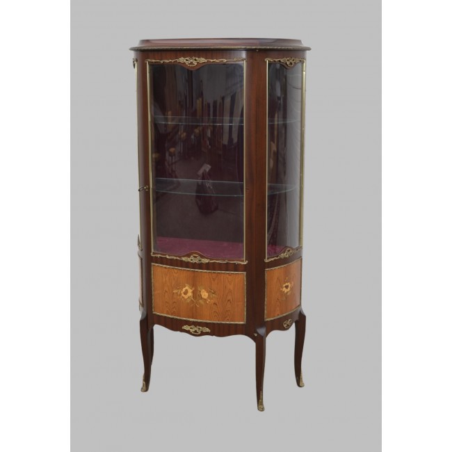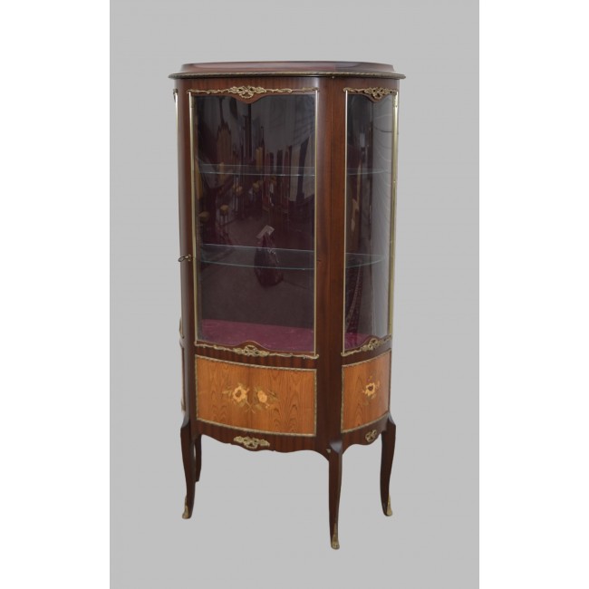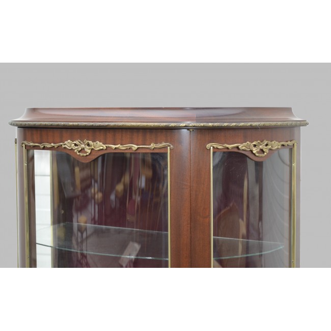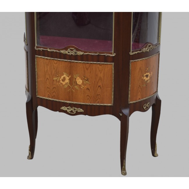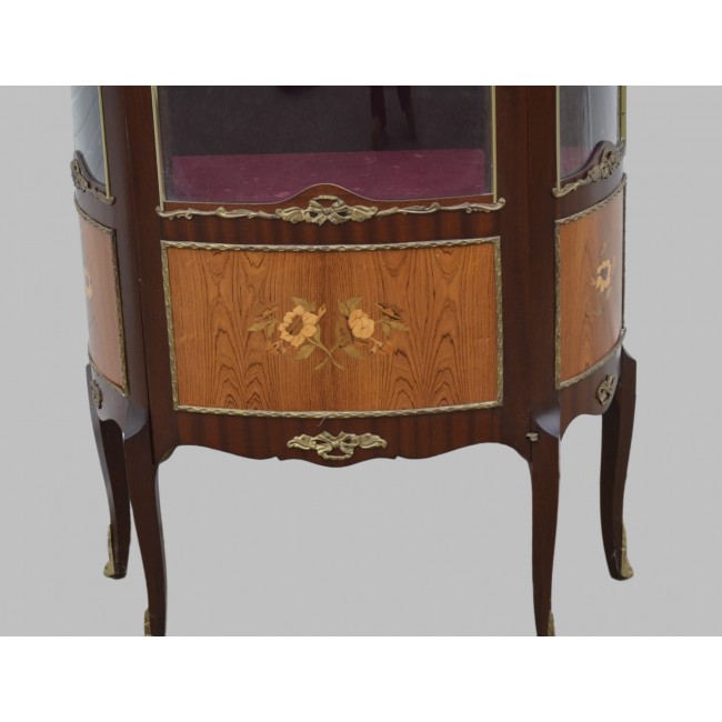 Vitrina in stil francez, din lemn cu furnir de mahon si intarsie, aplicatii din bronz, model curbat.