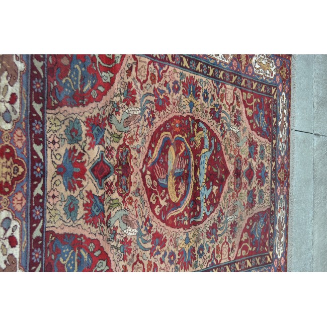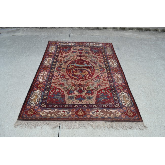 Covor Tebriz, lucrat manual cu lana, modele cu animale,culori vegetale, predominant rosu.