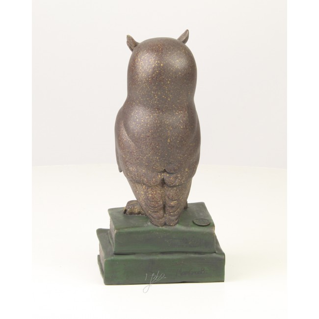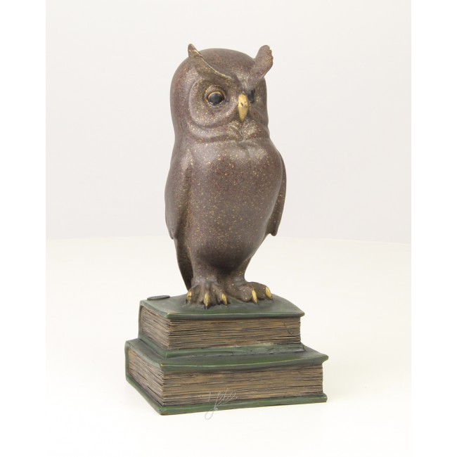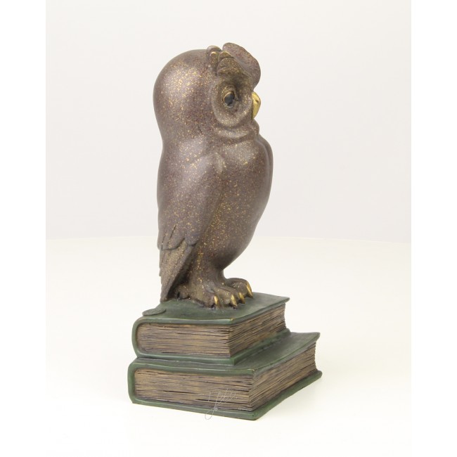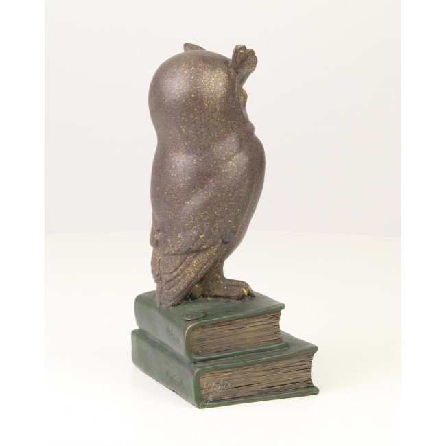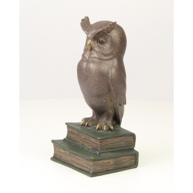Sculptura din bronz, bufnita inteleapta asezata pe carti.