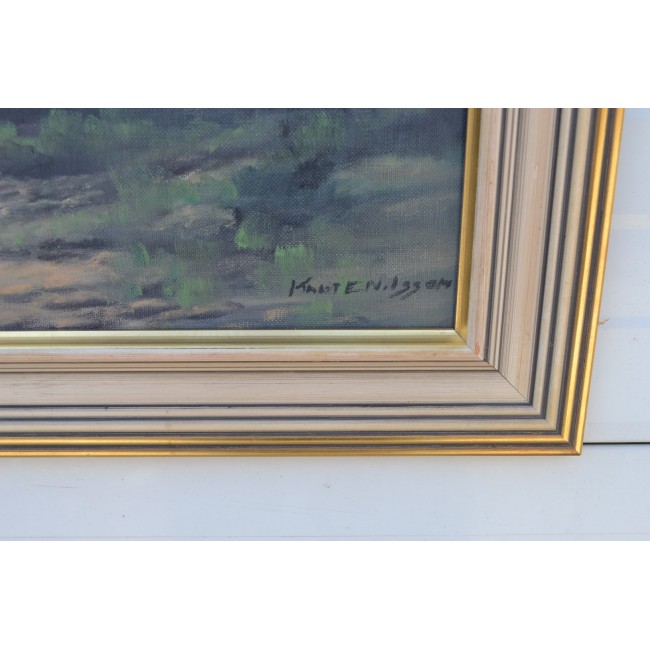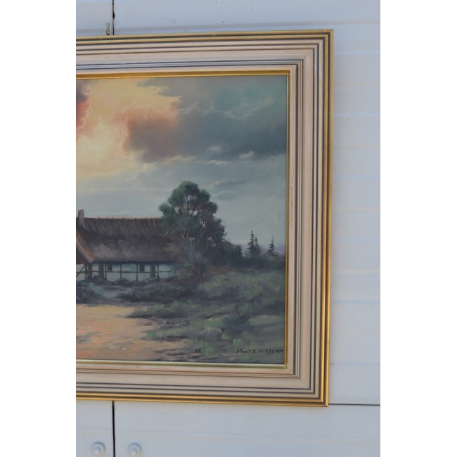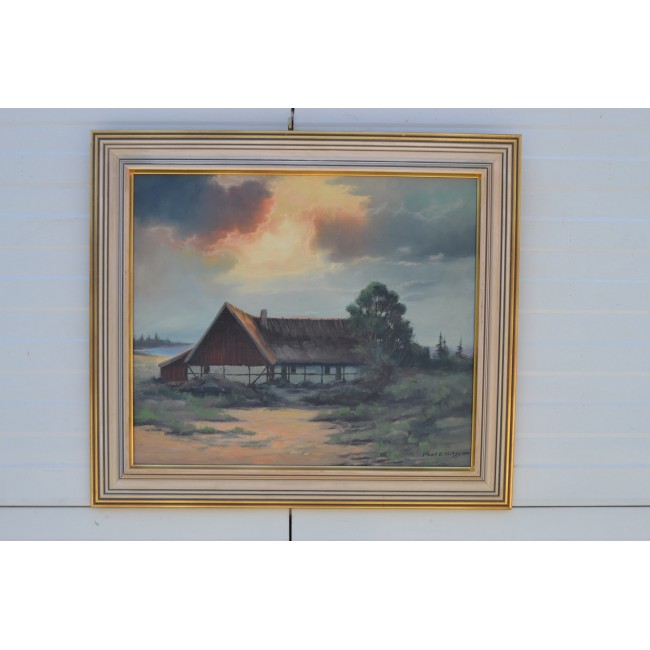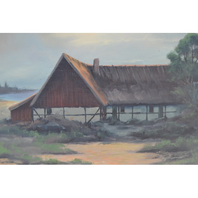 Tablou ulei pe panza, casa la malul lacului, semnat.