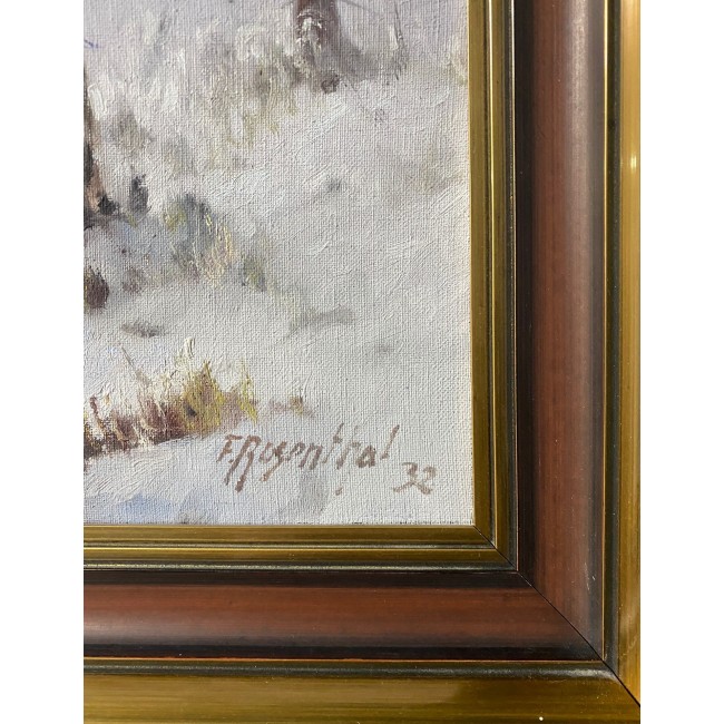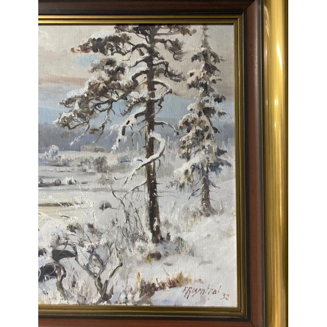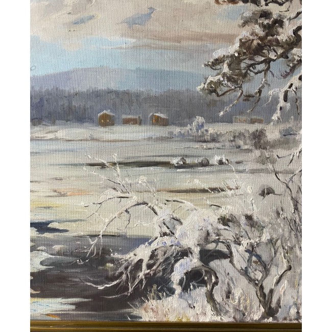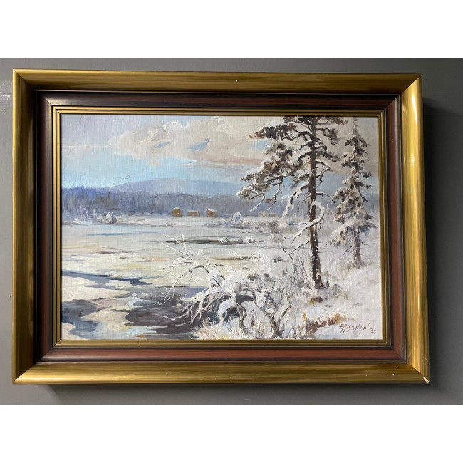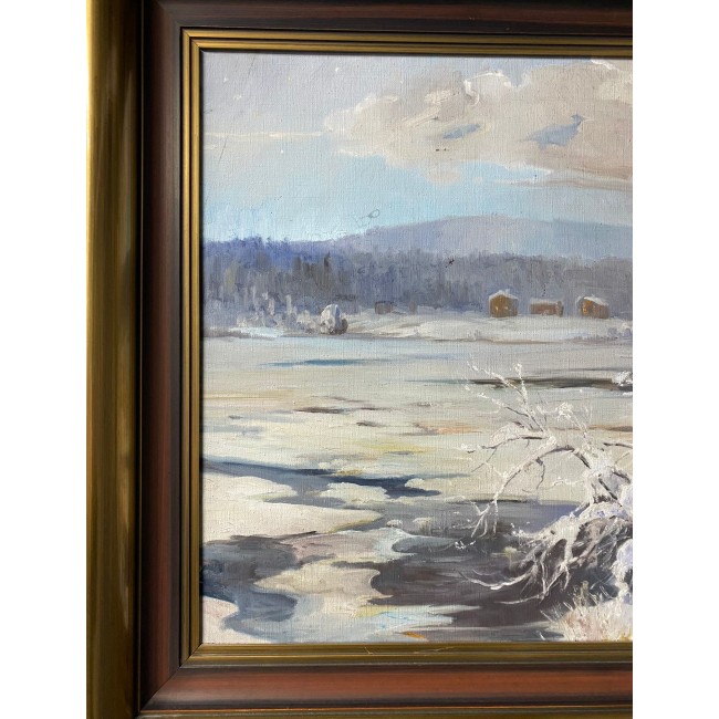 Tablou peisaj de iarna, ulei pe panza, semnat, rama aurie.