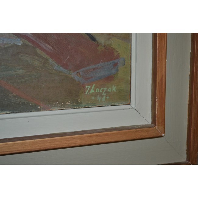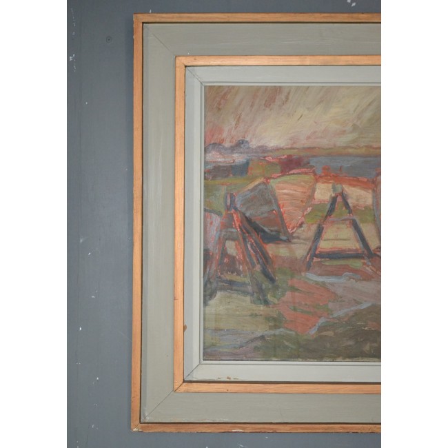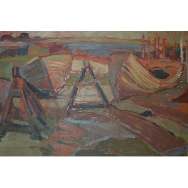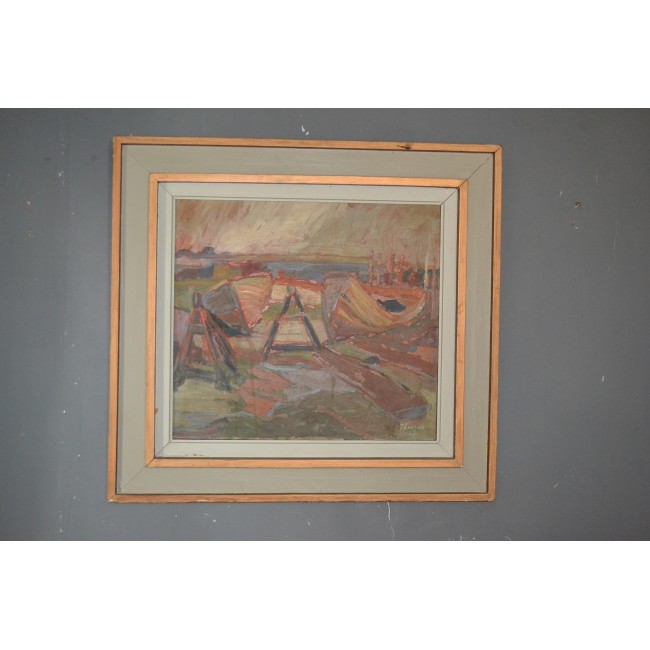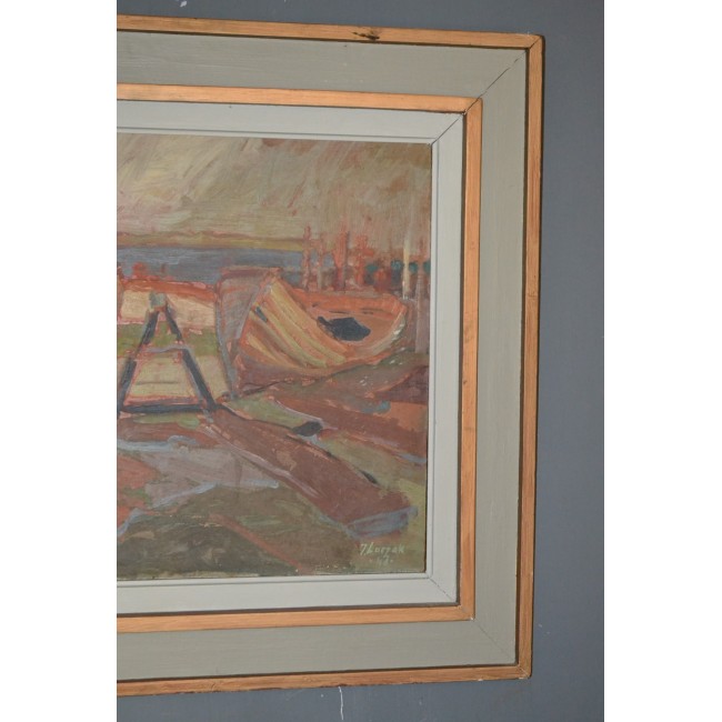 Tablou impresionist, ulei pe panza,tema marina-barci la tarm, semnat.