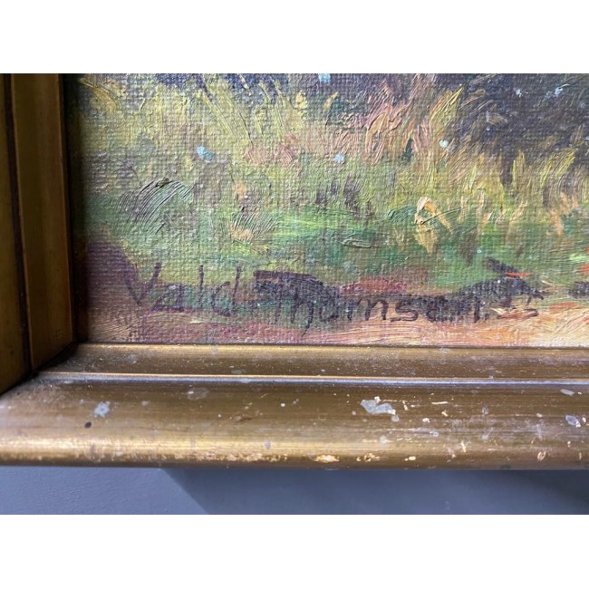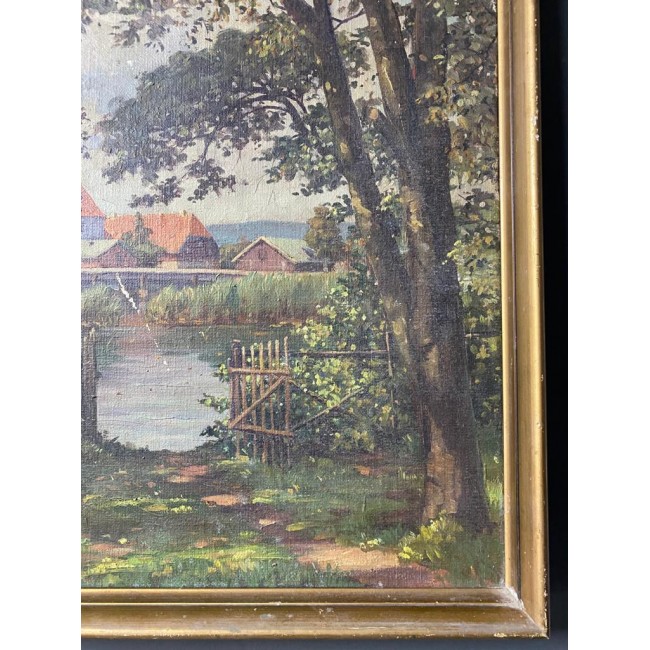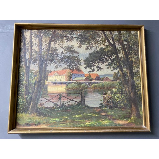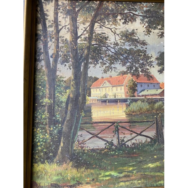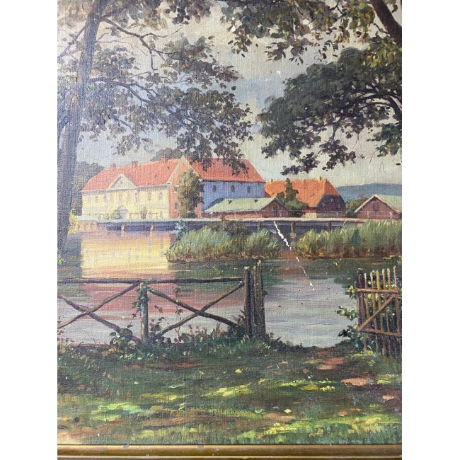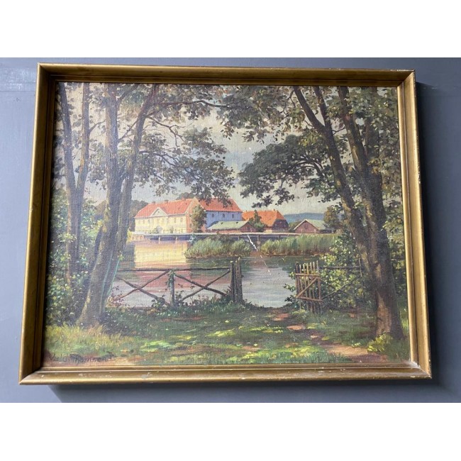 Tablou ulei pe panza, peisaj cu cladire, rama simpla aurie, semnat.