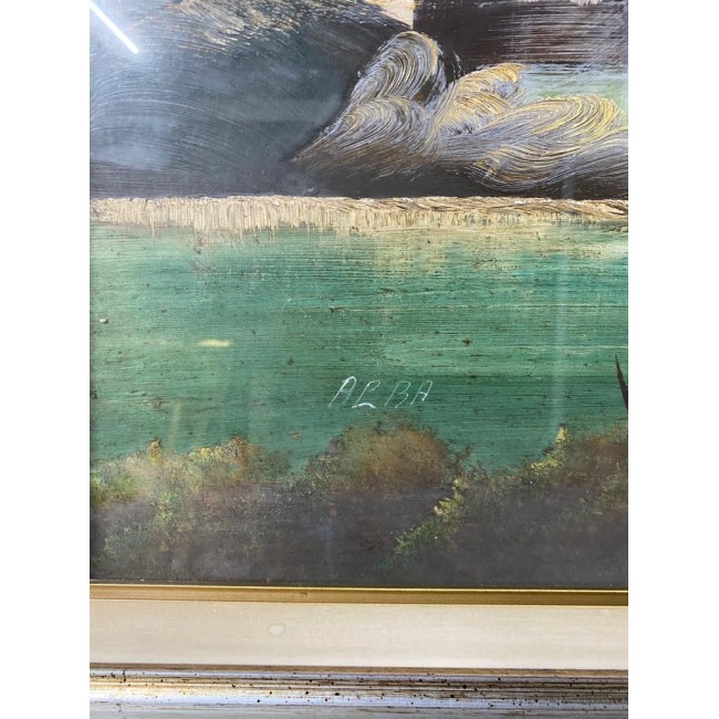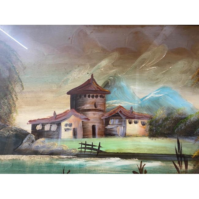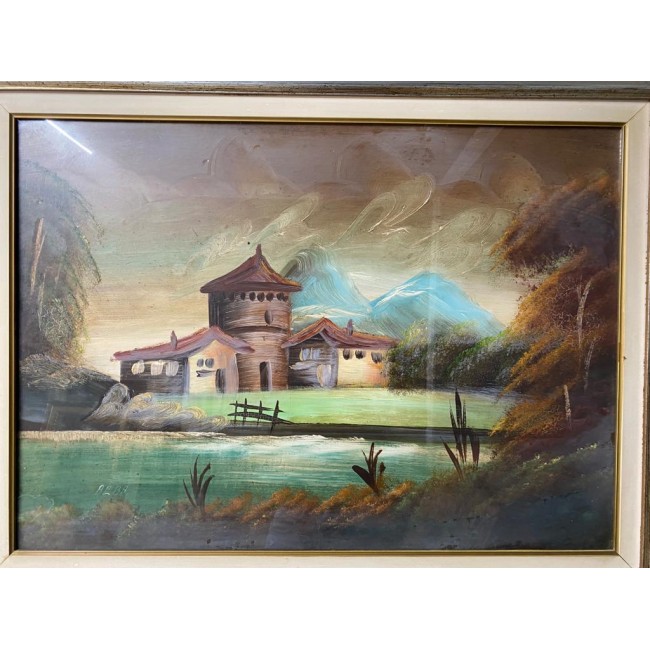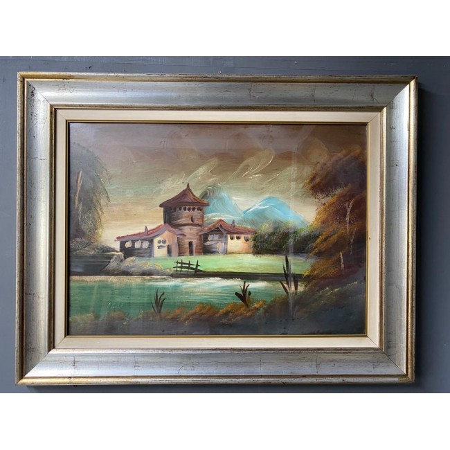 Tablou ulei pe panza, peisaj cu o constructie veche pe malul unui rau, semnat, rama argintie antichizata.