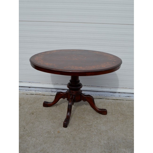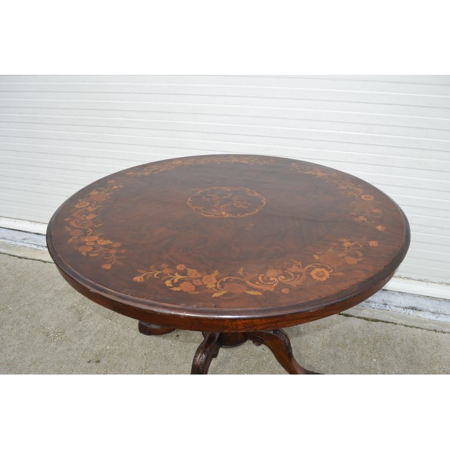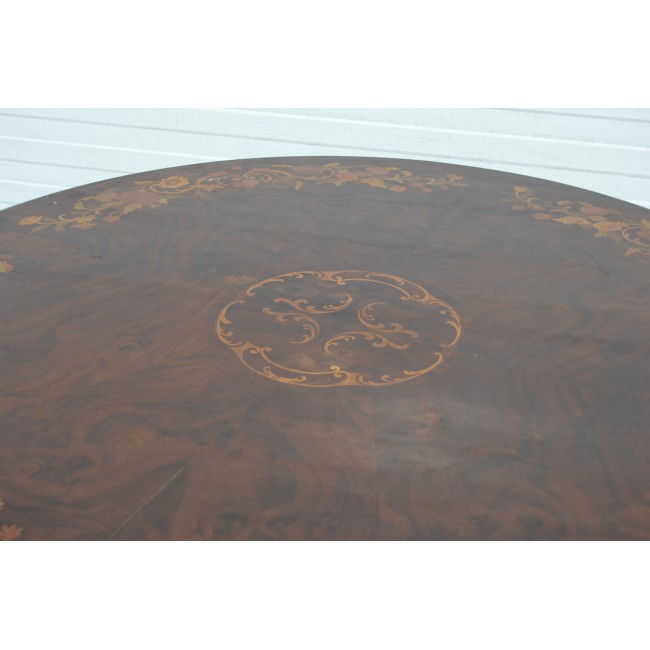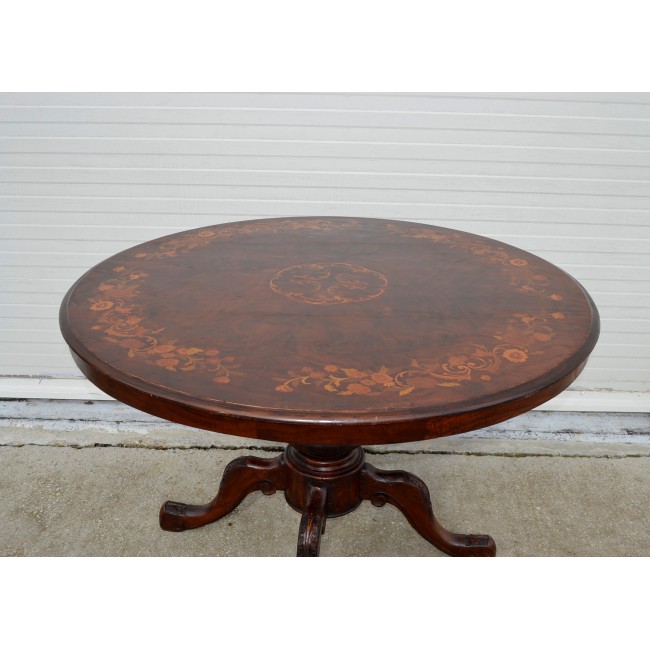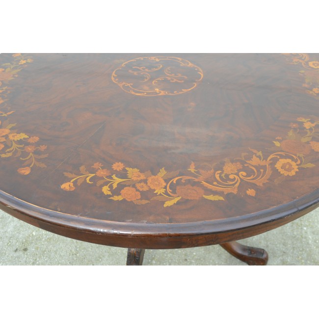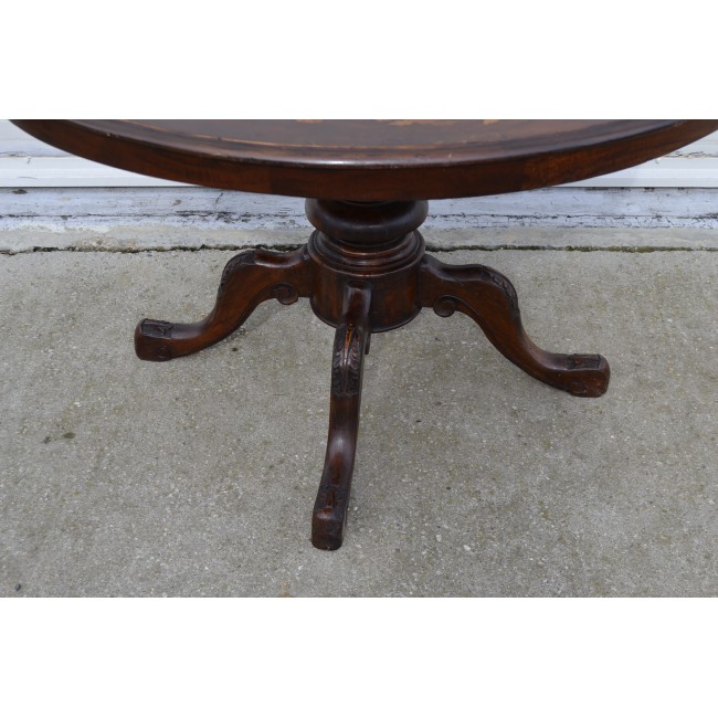 Masa pentru salon, in stil italian, din lemn cu intarsie si radacina de nuc, picior central cu sculpturi manuale, perioada 1900.