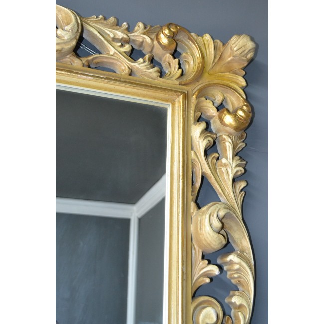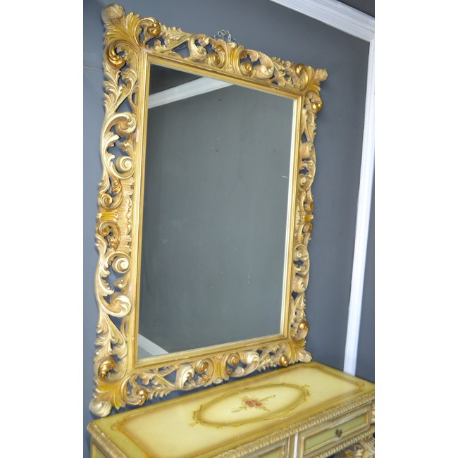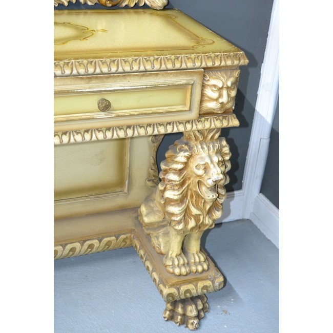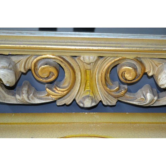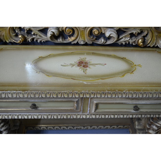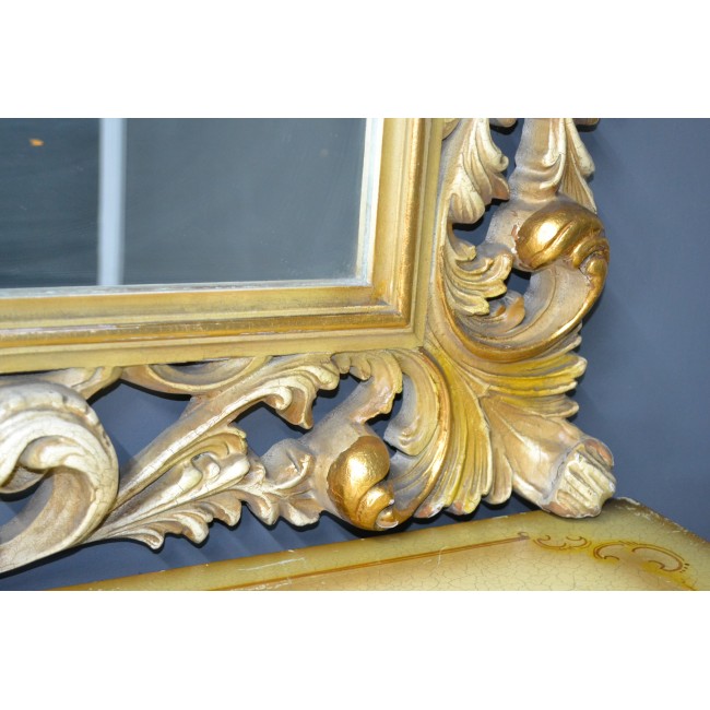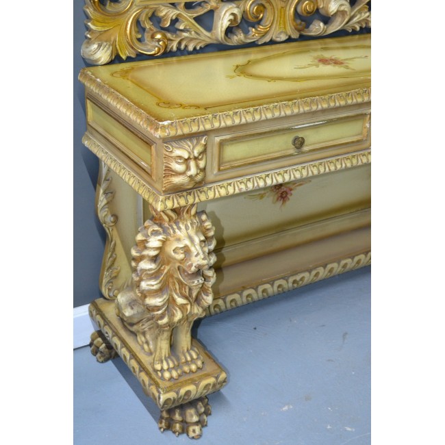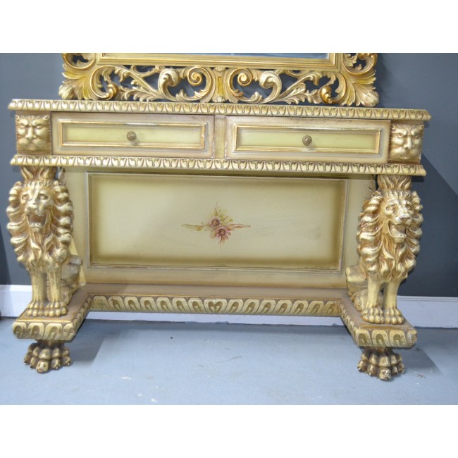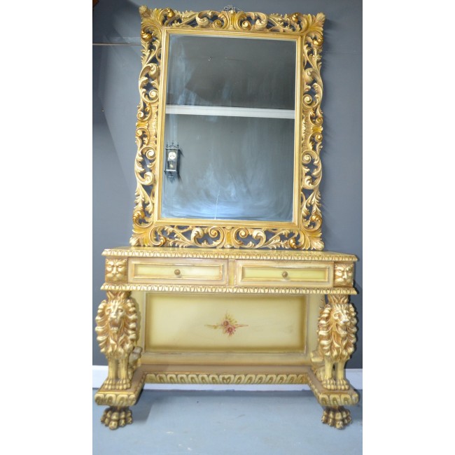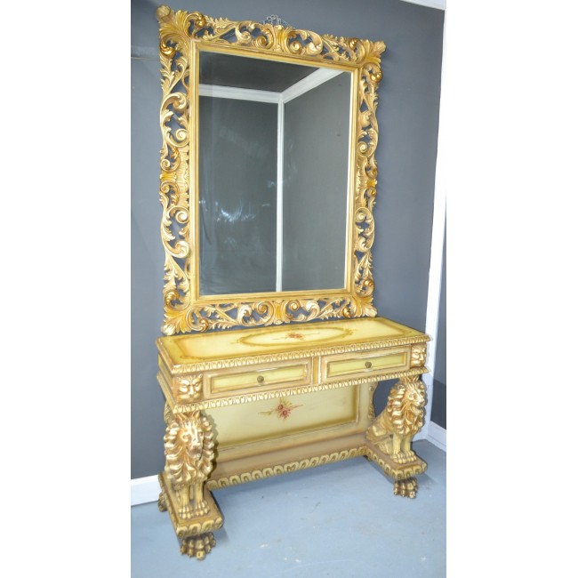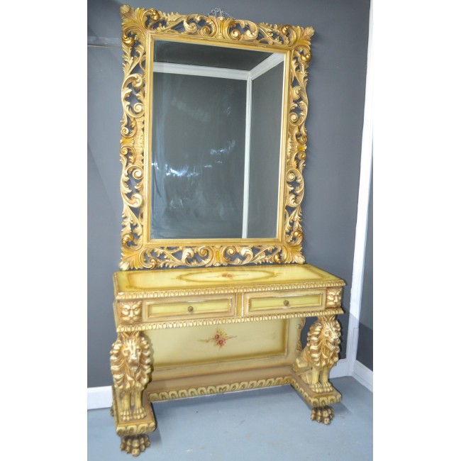Consola cu oglinda in stil baroc venetian, cu sculptura manuala si picioare in forma de lei, pictura manuala deosebita, perioada 1920.