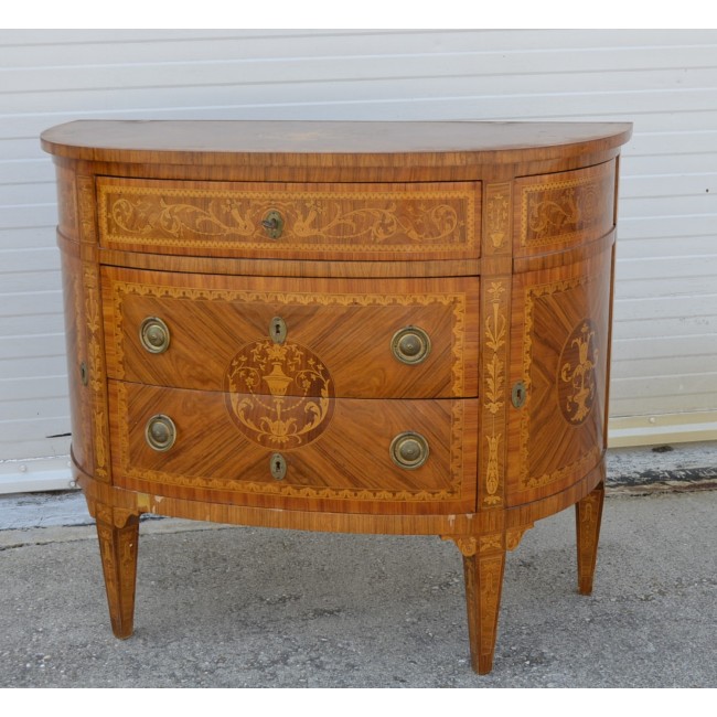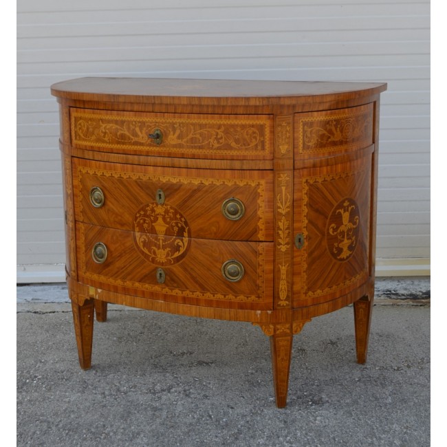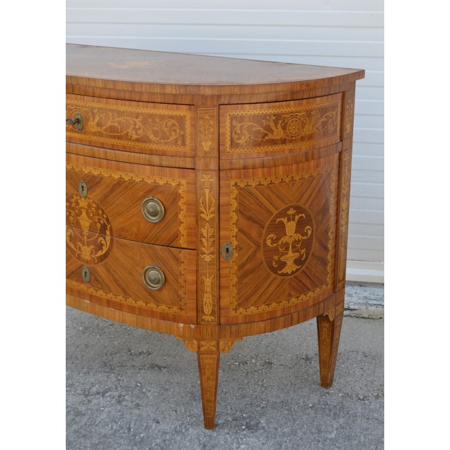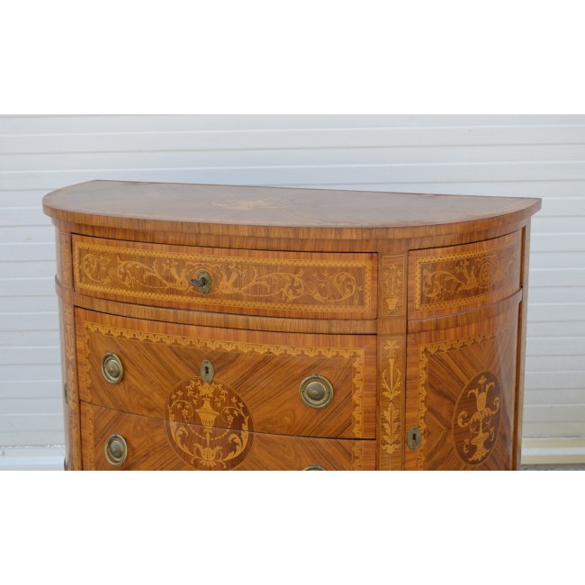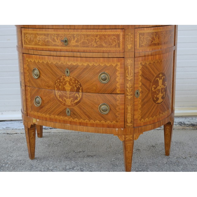 Comoda semirotunda in stil clasic italian, cu intarsii florale fine si detalii lucrate manual. Realizata din lemn masiv cu furnir nobil, prevazuta cu 3 sertare spatioase si manere metalice. Piesa eleganta, perfecta pentru un interior rafinat sau vintage.