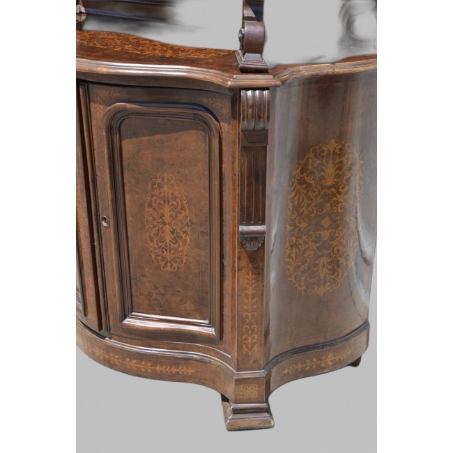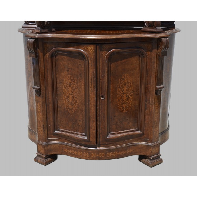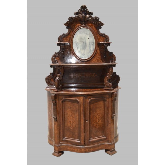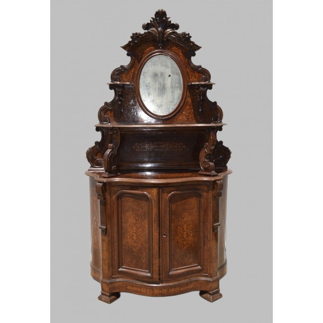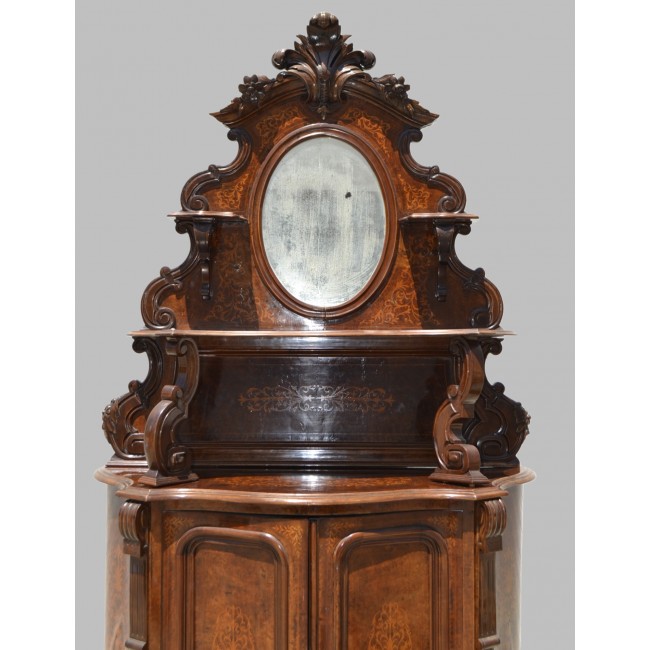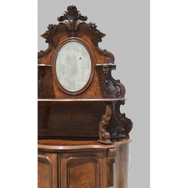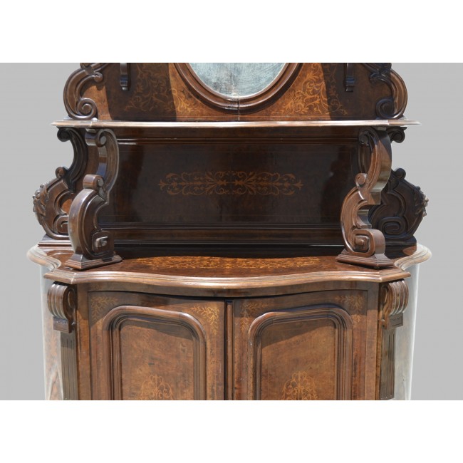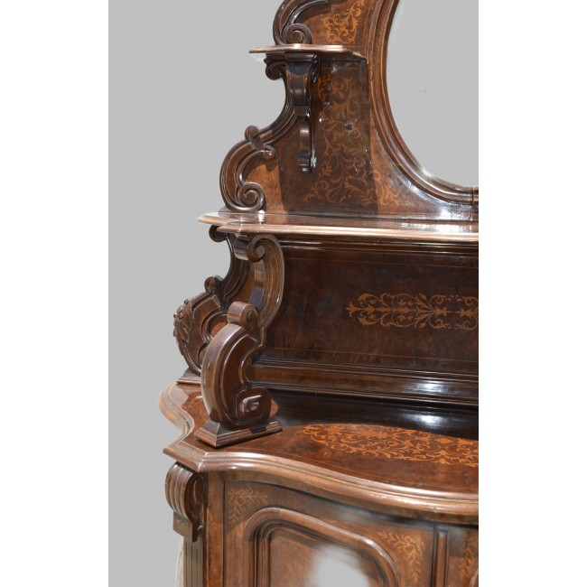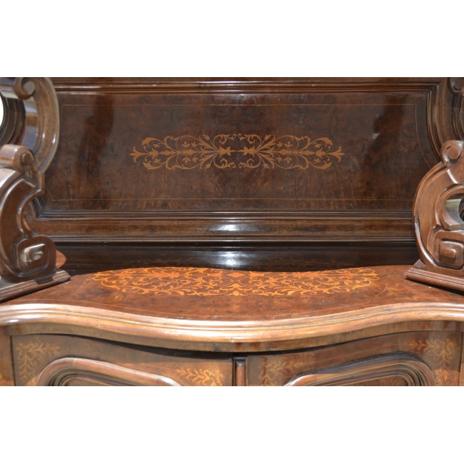 Servanta italiana in stil Carlo X, realizata din lemn de nuc cu intarsii bogate si finisaj lucios. Partea superioara are oglinda originala si fronton sculptat manual, perioada 1860.